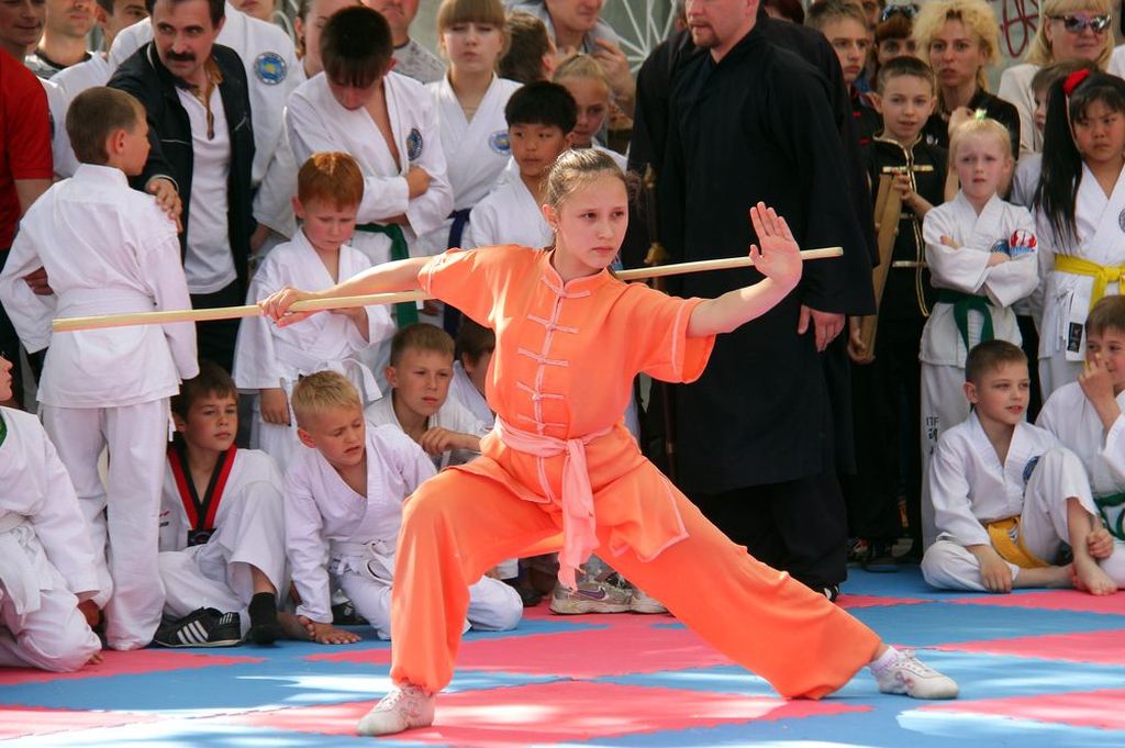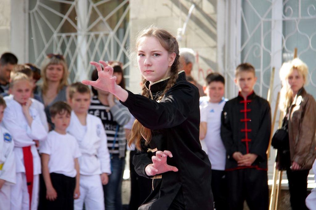 Гибкость, легкость, красоту и грацию продемонстрировала в своем выступлении спортсменка Днепропетровской федерации спортивного и традиционного у-шу Мария Жилка. По словам девушки, она уже три года занимается у-шу. "Мне нравится работать с оружием, - говорит Маша. - Вот палка, еще у меня есть копье, меч, сабля, веер. Каждый выбирает себе тот вид оружия, который подходит по его движениям, стилю, эмоциям. У нас говорят, что не ты выбираешь оружие, а оно выбирает тебя". Мария была одета в очень красивую одежду для занятий у-шу. Хоть она и серьезная спортсменка, но все же, в первую очередь, девушка. Поэтому ее одежда кое-где украшена стразами и бантиками.