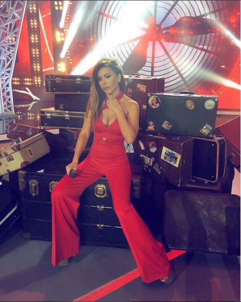 На снимке певица позирует в алом концертном костюме с глубоким декольте.