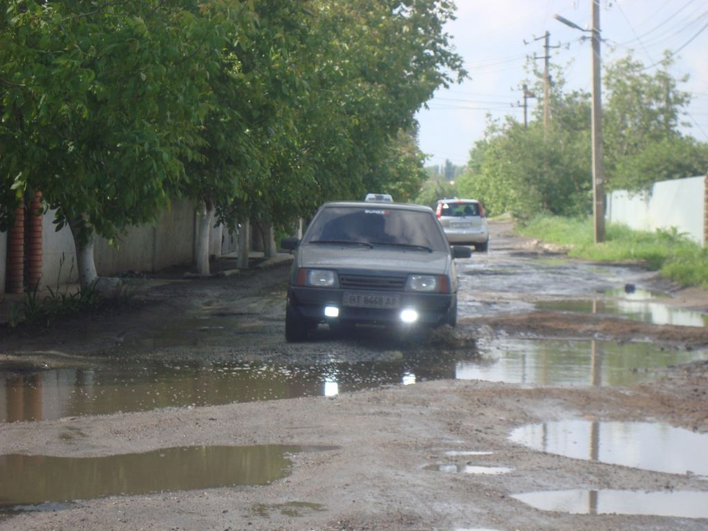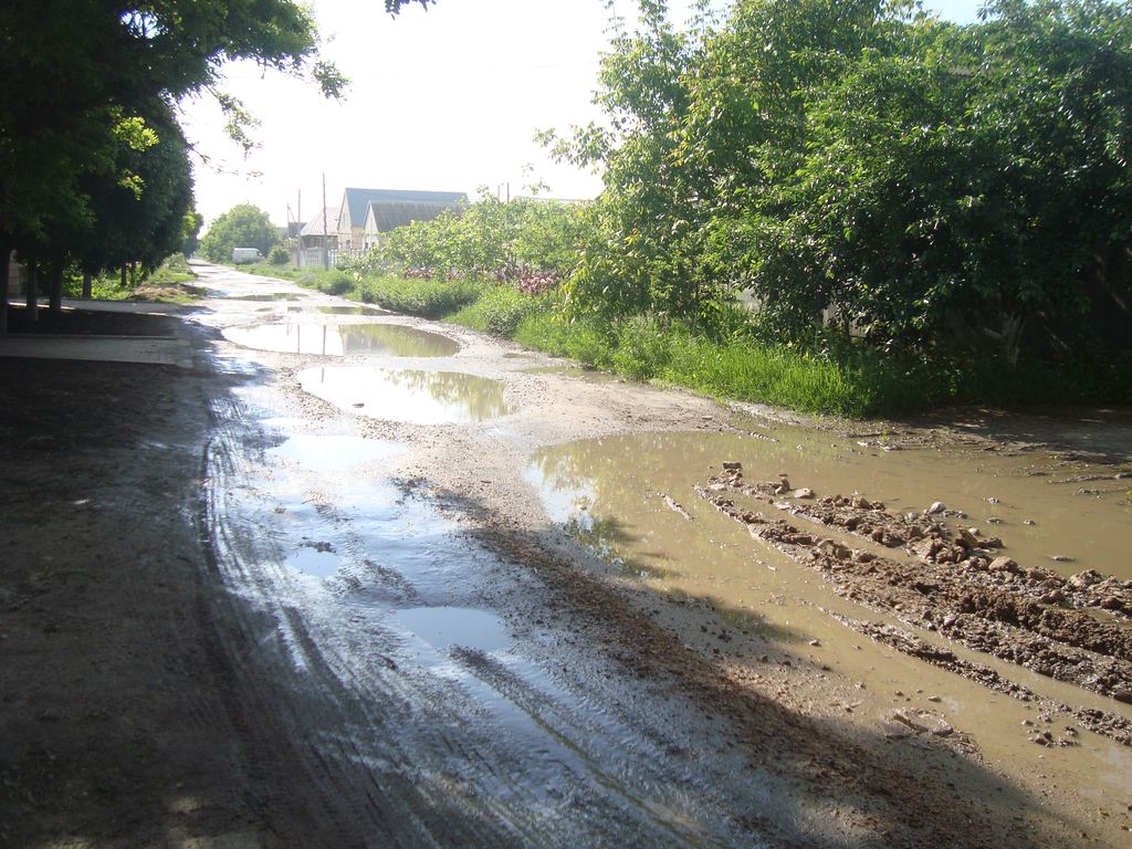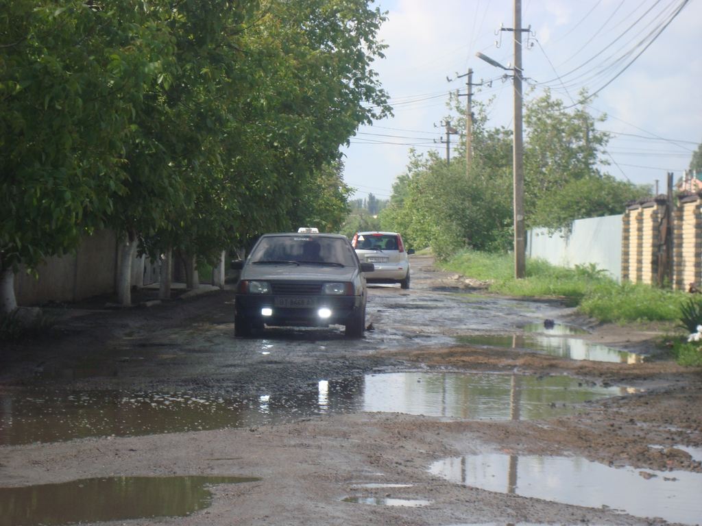 Тем временем в ста метрах от нас, буквально вброд, дорогу-лужу пересекает подросток, причем идет он явно по какому-то давно проторенному броду, но, тем не менее, его ступни полностью утопают в грязной воде. Пока мы добрались до него, подросток уже вышел на сухое место и принялся переобуваться в летнюю обувь из резиновой осенней. Увидев мое удивление этой картиной, Петр Петрович поясняет, что в дождливую погоду тут многие так делают - обойти эту улицу с ее гигантской лужей-морем невозможно, вот люди и переобуваются «на суше». Кстати, улица, где паренек начал переобуваться, разительно отличается от той, по которой мы движемся - там вода не задерживается, хотя асфальта тоже не видно. Просто там люди, как пояснил тот же Петр Петрович, живут дружнее и, ни на кого не надеясь, время от времени подсыпают дорогу щебнем. Правда, у них и улица не такая насыщенная транспортом, как Казацкая, что тоже в наших условиях хорошо, их дорогу не так «разбивают» машины.