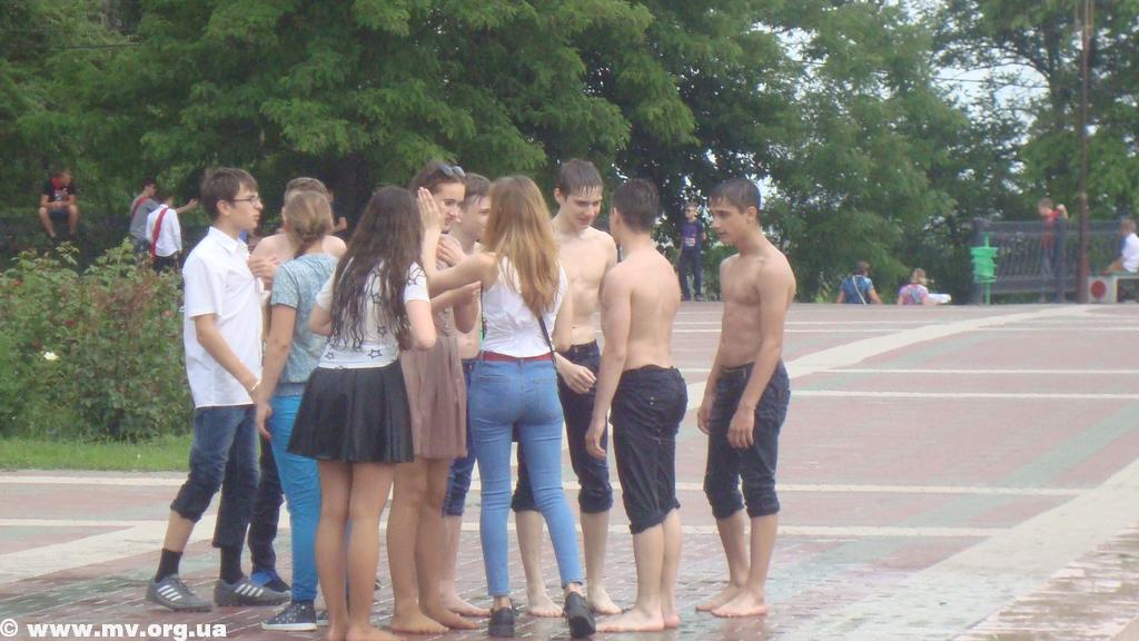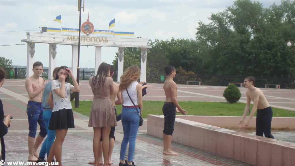В городском фонтане на пл. Победы мальчишки и девчонки купаются, брызгают друг на друга водой, визжат и радуются началу каникул. Тем временем с другой стороны фонтана группа очень серьезных девочек в парадной школьной форме чинно фотографируют друг друга на телефон на фоне фонтанных струй и арки Победы. Чуть в стороне, спрятавшись в тени, парень угощает одноклассницу сигареткой. Все лавочки на площади заняты, у всех молодых людей в руках бутылочки с тоником и напитками.