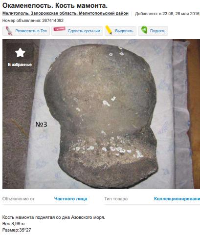 Житель Мелитополя выставил на продажу необычный товар — кость мамонта. Автор объявления утверждает, что она поднята со дна Азовского моря. За окаменелость продавец просит 8 000 грн.
