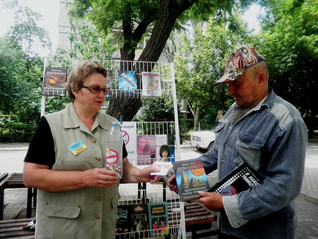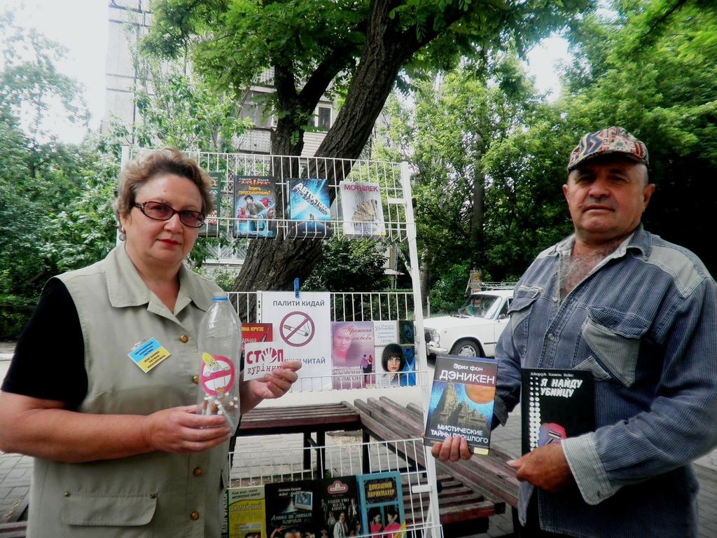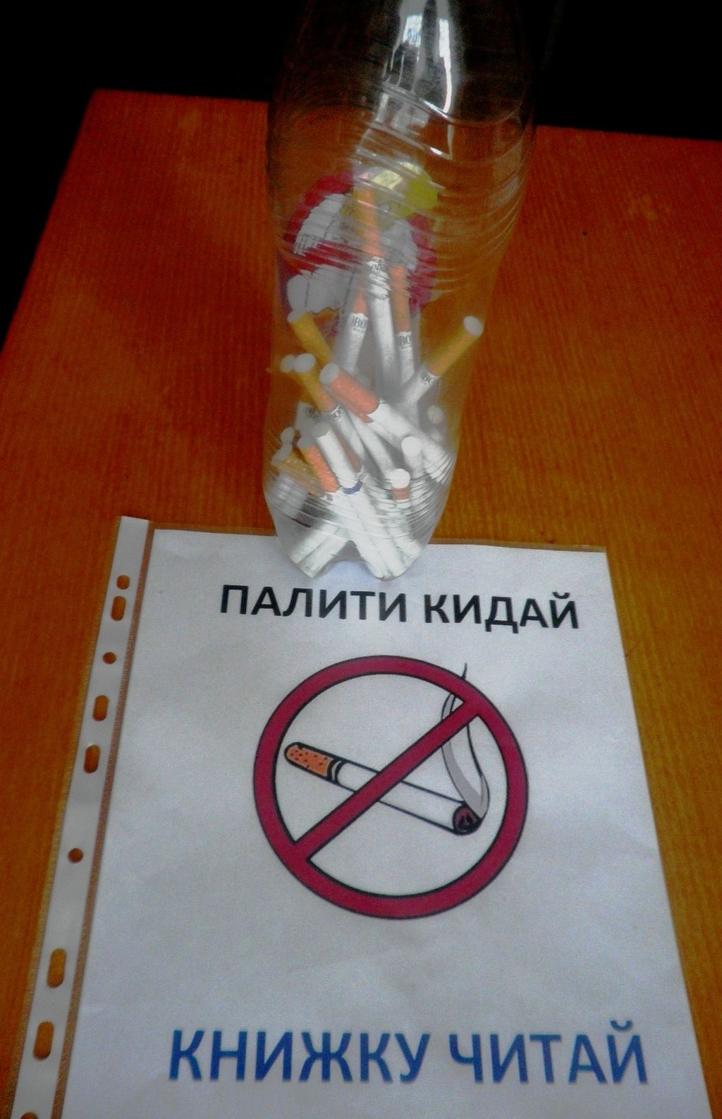 Сотрудники библиотеки им. М. Горького вышли на улицу и здесь в самом оживленном месте, где множество прохожих, раздавали специально изготовленные листовки "Стоп курению!", рассказывали впечатляющие факты. Например, что каждые 6 секунд в мире умирает один курильщик; что амбра (блевота китов) добавляется в сигареты для аромата; что уровень курения среди малообразованных людей выше, чем среди получивших образование; что средств, которые потрачены на сигареты за 10 лет, хватило бы на покупку иномарки среднего класса, такой как "Форд-Фокус" или "Ауди А4" и другие.