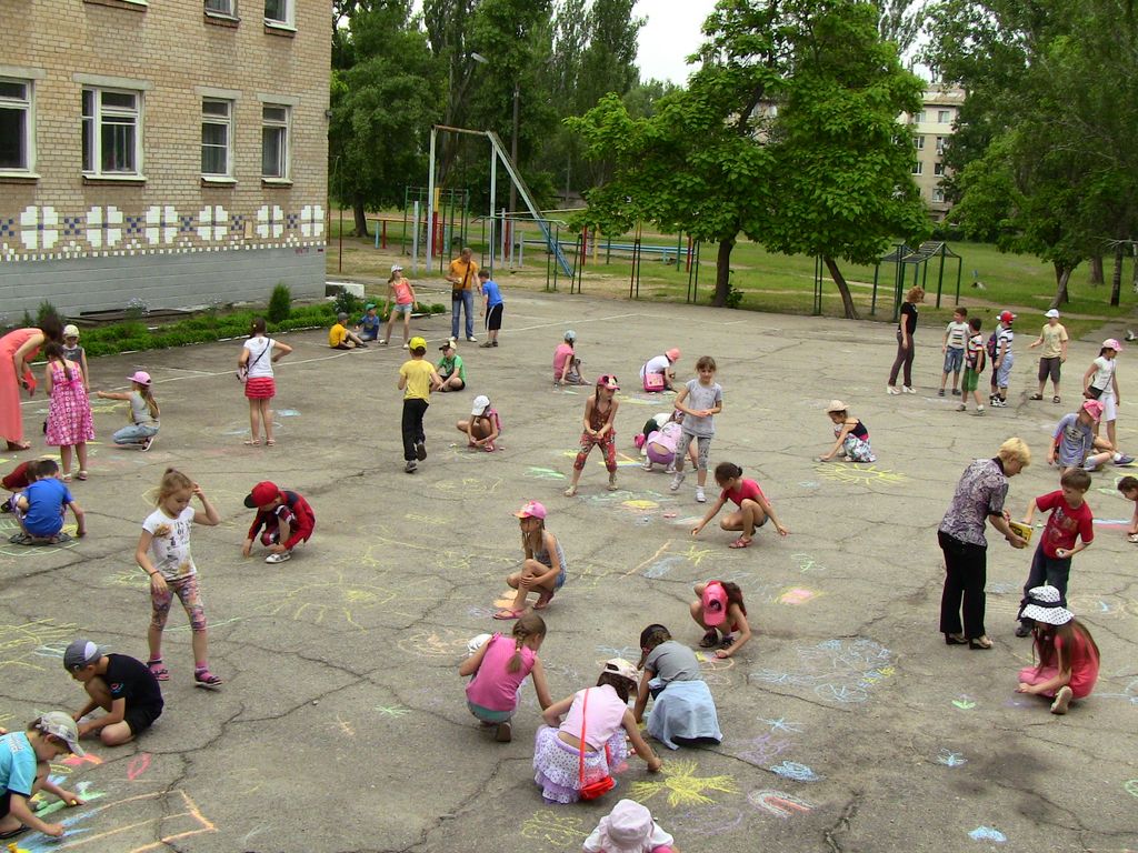 Завершил мероприятие конкурс рисунка на асфальте "Счастливое детство", во время которого дети рисовали яркое солнце, голубое небо и родной дом, некоторые рисовали счастливую семью.