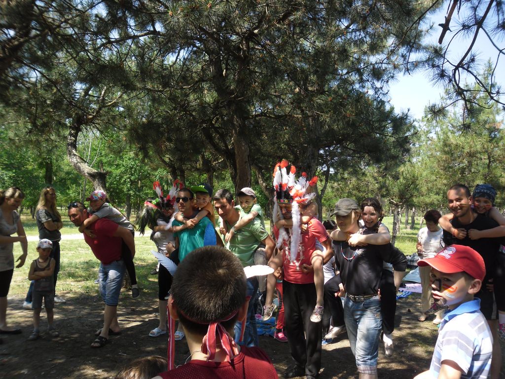 В воскресный день в лесопарке собрались четыре отважных «индейских племени" - а именно столько было команд-участниц, в состав которых вошли дети и их родители. Они соперничали между собой: скакали на "лошадях" (воздушных шарах), представляли без слов, а только лишь звуками, свои племена, объезжали "мустангов" (ездили на спинах своих родителей), наносили боевую раскраску, придумывали имена своим "соплеменникам".