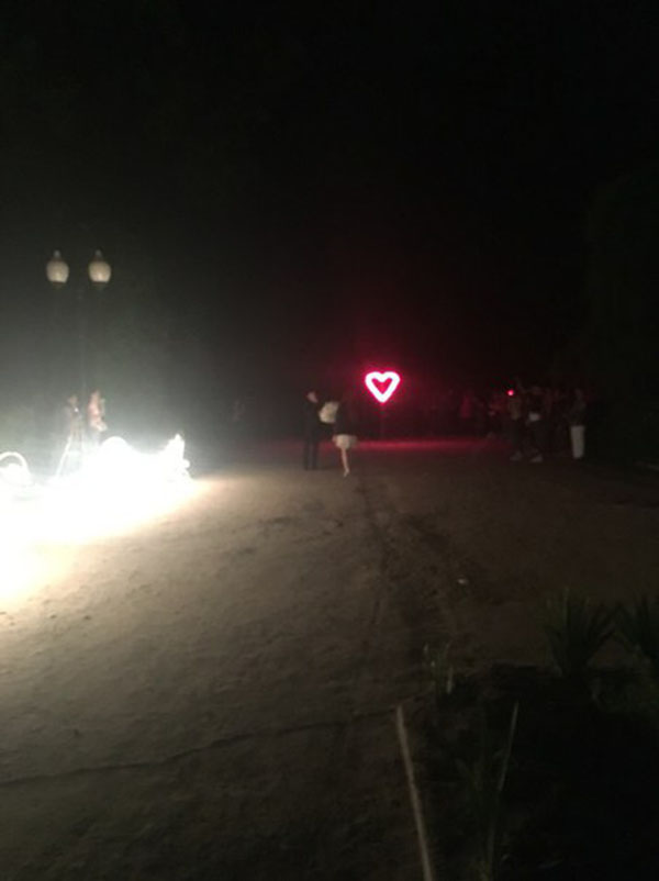 На несколько минут на аллеях погас свет, а на площадке появилось горящее сердце в фонтанах фейерверков. Такой сюрприз подготовил молодой человек своей невесте. Вручив девушке роскошный букет цветов, он признался ей в любви.