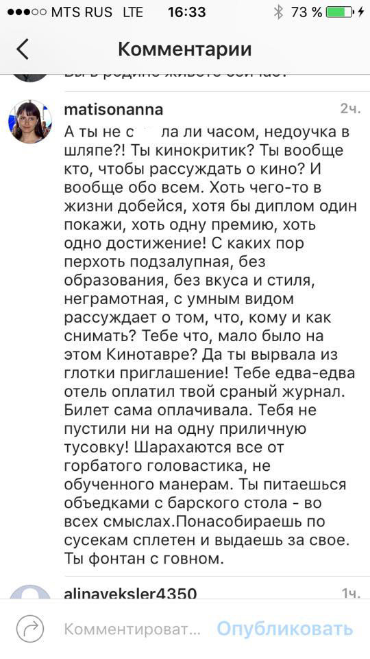 «А ты не о***ла ли часом, недоучка в шляпе? Ты кинокритик? Ты вообще кто, чтобы рассуждать о кино? С каких пор перхоть подзалупная, без образования, вкуса и стиля, неграмотная, с умным видом рассуждает о том, что, как и кому снимать?», — обрушилась на Божену незваная гостья.