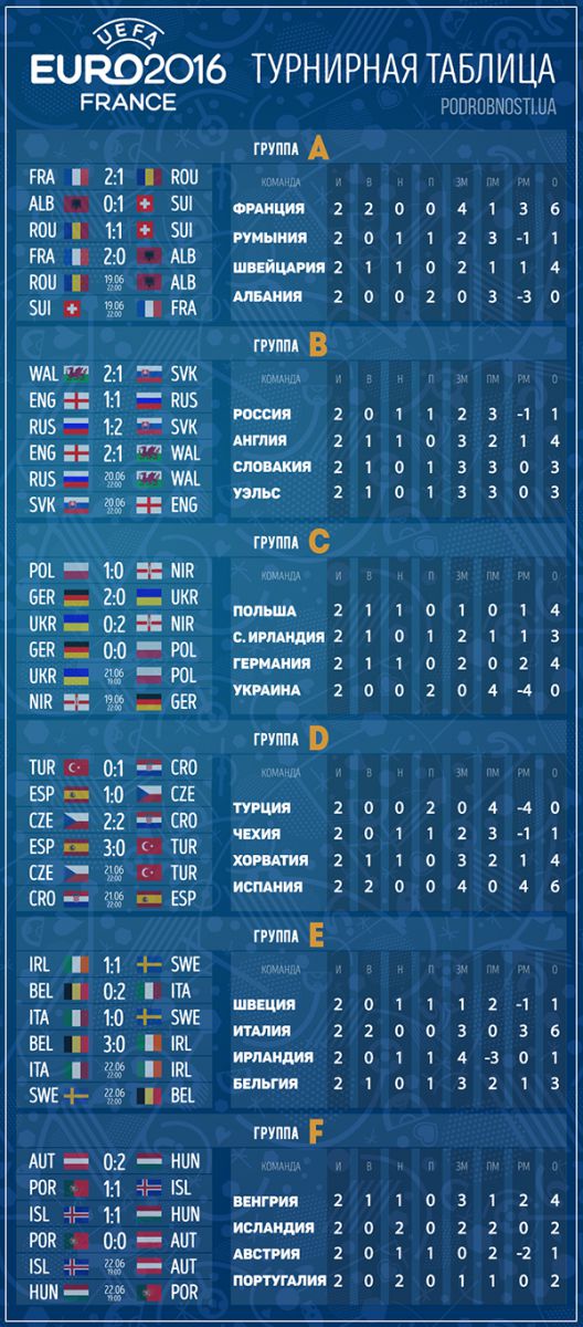 16 июня Украина потерпела второе поражение на Евро-2016 от Северной Ирландии - 0:2 и занимает последнюю строчку в группе. В британском дерби Англия победила Уэльс - 2:1. Германия с Польшей разошлись миром - 0:0.