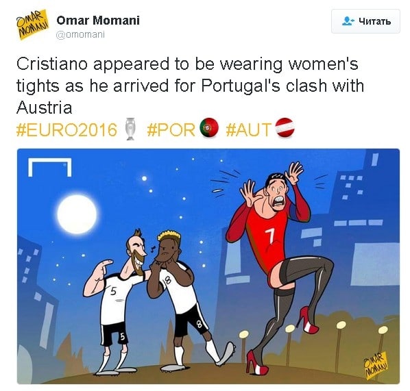 Журналисты заметили лидера сборной Португалии перед матчем с Австрией в женских чулках. Об этом в своем Facebook рассказало авторитетное британское издание Goal.com.