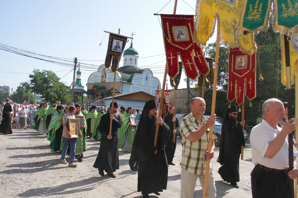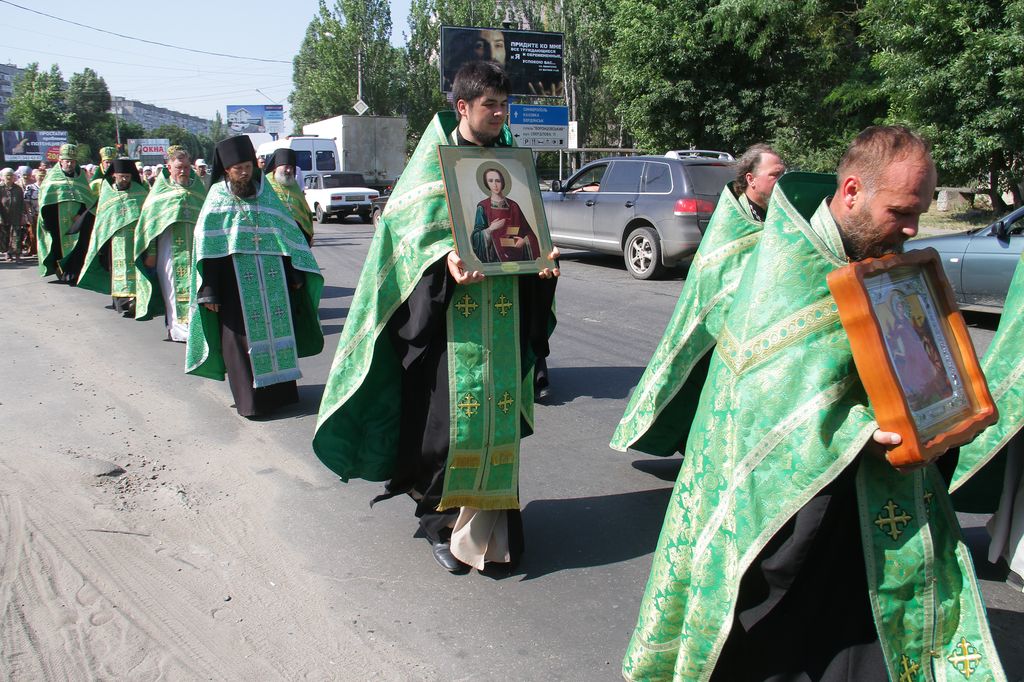 Сегодня в Мелитополе состоялся крестный ход. Более ста прихожан и священнослужителей прошли колонной по дороге от храма св. прп. Серафима Саровского (ул. Петра Дорошенко (бывш. Горького) по улице Героев Украины (бывш. Кирова), Воинов-интернационалистов, Интеркультурной (бывш. Джержинского) до храма св. Праведного Иоанна Кронштадтского (ул. академика Королева) на Новом Мелитополе.