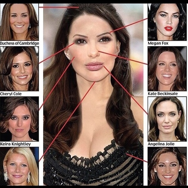 И вот при помощи компьютерной программы, которая сопоставила все необходимые составляющие, вывела портрет той самой идеальной женщины в мире. Кирпичиками для абсолютной красавицы стали волосы герцогини Кембриджской Кейт Миддлтон, нос Кейт Бекинсейл, глаза Шерил Коул, щёки Киры Найтли, брови Меган Фокс, подбородок Гвинет Пэлтроу, губы Анджелины Джоли и грудь Келли Брук.
