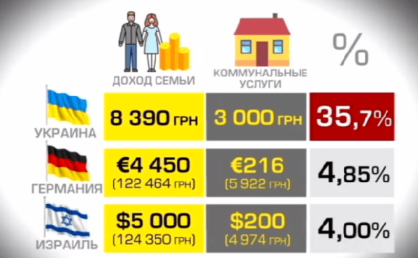 Отмечается, что в сравнении с Германией и Израилем в Украине невысокие затраты на коммунальные платежи. Однако у украинцев очень маленькие зарплаты по сравнению с немцами и израильтянами.