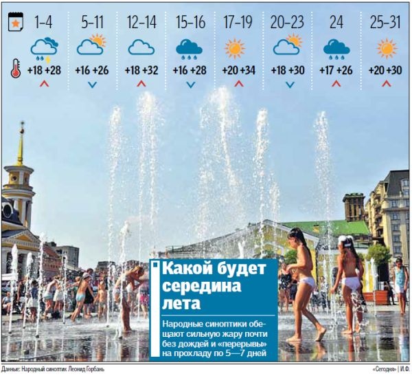 Метеосайты обещают, что дневная температура июля выше 32—34 ожидается лишь на юге и востоке Украины, причем почти без дождей и даже без облаков. В остальных регионах — 28—30, зато с осадками каждые два-три дня. Комфортнее всего будет на Львовщине и Волыни — почти весь месяц продержится температура 25—27 градусов.