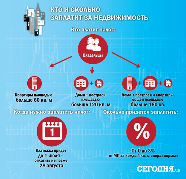 До 1 июля налоговая служба разошлет решения-уведомления и квитанции с суммами налога. Заплатить нужно не позднее 28 августа. Налог взимается раз в год. Кроме того, владельцам большого жилья (более 300 квадратных метров для квартир и 500 – для домов) придется дополнительно заплатить 25 тысяч гривен.