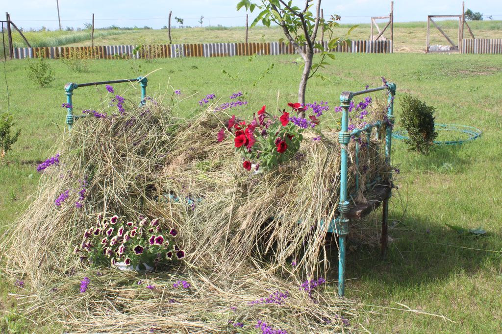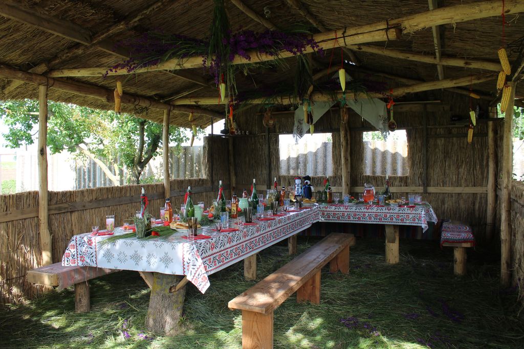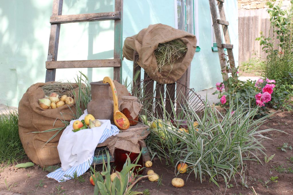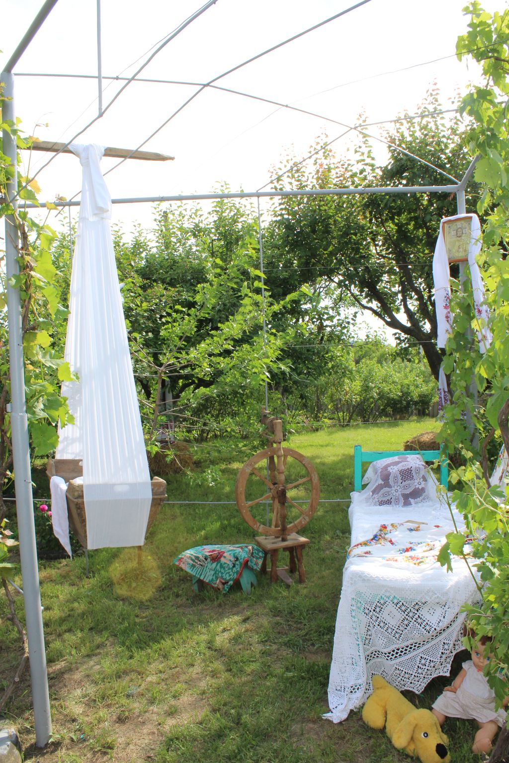 В уютном заднем дворе хозяева установили деревянную беседку, в которой свободно поместится до двадцати человек отдыхающих. А вокруг необычные композиции из старых вещей, рядом большая лавка-качели. Также здесь вам предоставят мангал и накормят экологически чистыми продуктами. Даже хлеб в селе пекут сами.