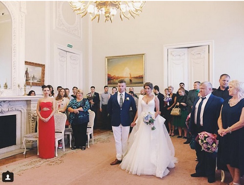 Юлия выбрала пышное свадебное платье жемчужного цвета на тонких бретельках и с роскошным декольте. Образ невесты дополнял нежный букет из голубых, розовых и белых цветов. Игорь же облачился в белую рубашку, полосатый галстук, синий пиджак и белые брюки.