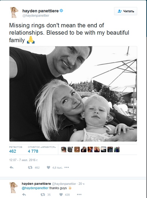 Ранее западные СМИ заметили актрису без кольца на безымянном пальце во время похода по магазинам и заявили о размолвке в отношениях Хайден и Владимира. Но Панеттьери все отвергла и написала, что просто забыла надеть кольцо.