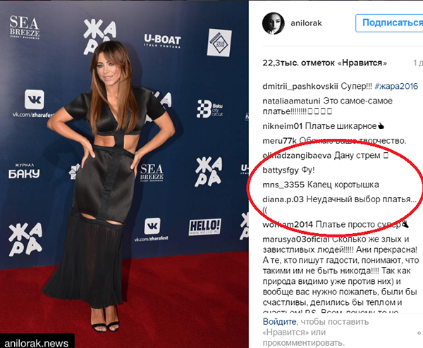 Украинская певица Ани Лорак подверглась жесткой критике со стороны своих поклонников. В частности, на красной дорожке фестиваля «Жара-2016» в Баку артистка появилась в не своем удачном платье, чем вызвала бурю обсуждений в своем Instagram.