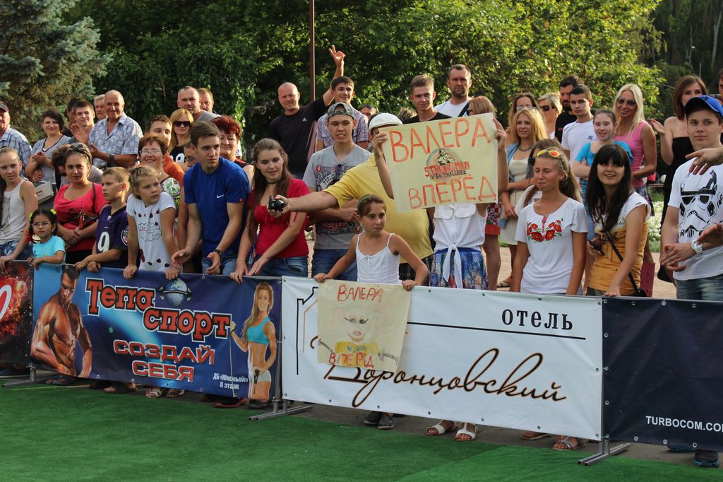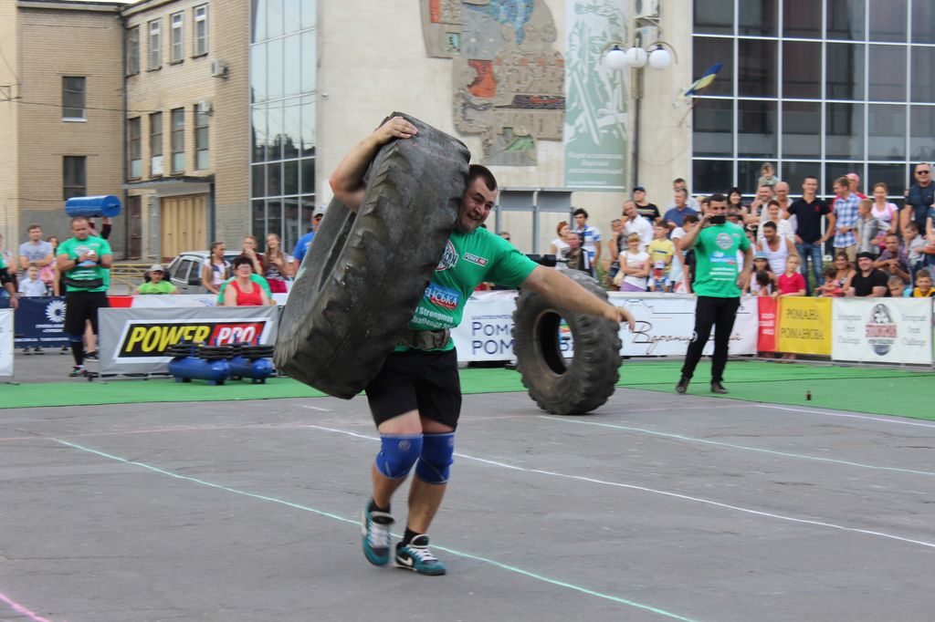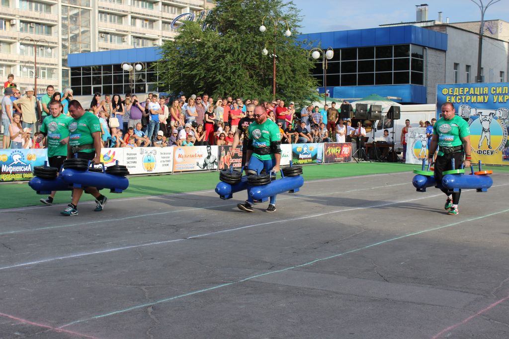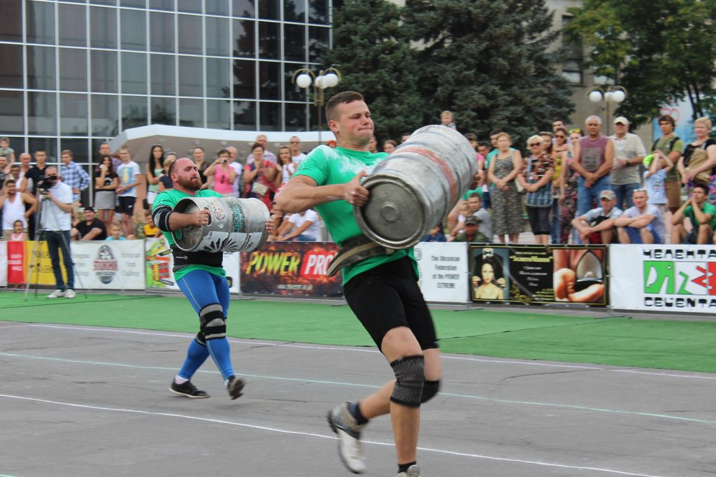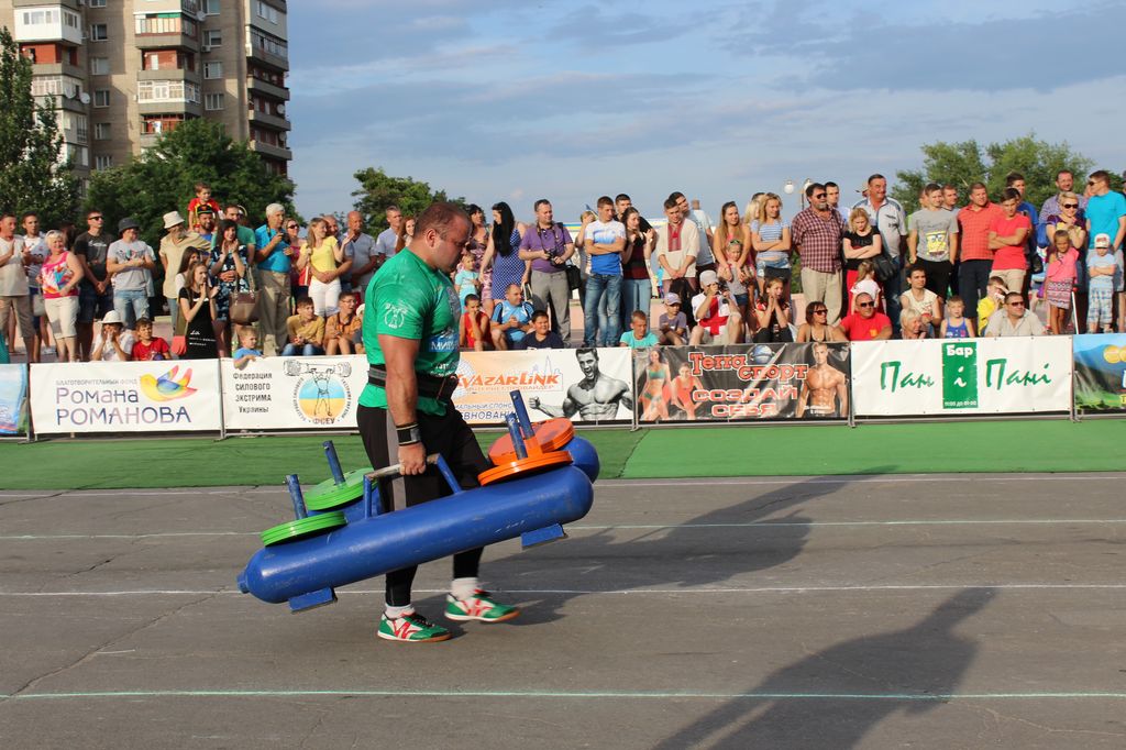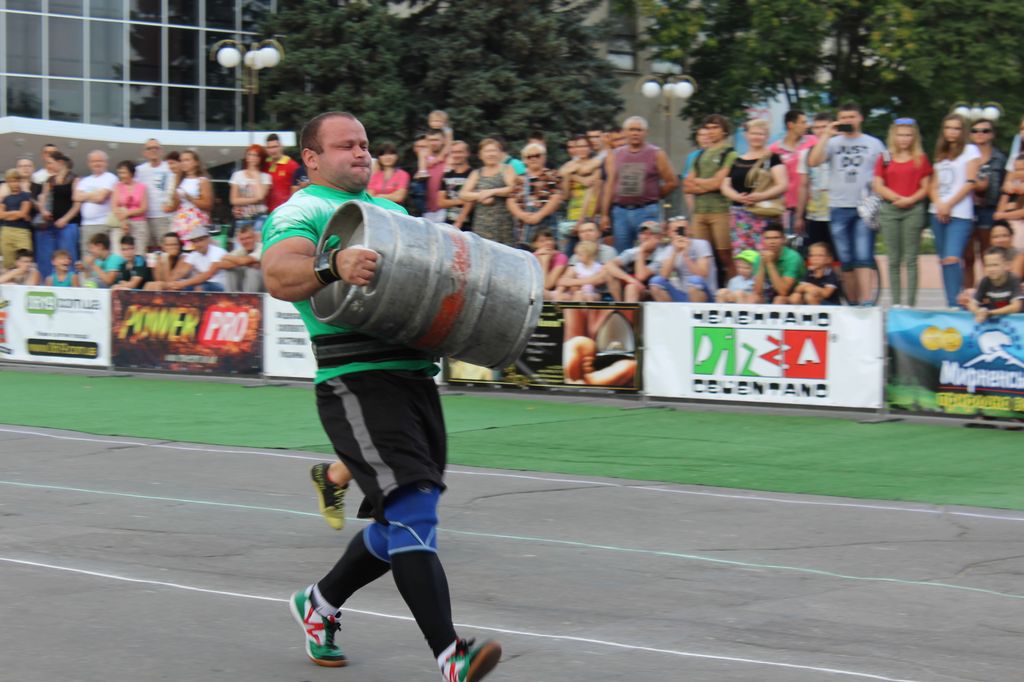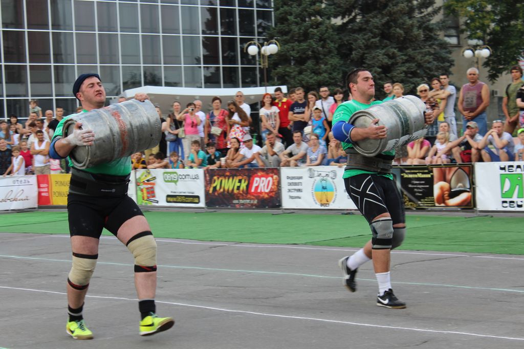 В бескомпромиссную борьбу, поддерживаемые зрителями, вступили 10 силачей: девять лучших стронгменов из разных регионов страны - Денис и Антон Дубровские (Киев), Иван Блинов (Запорожье), В. Газаев (Мелитополь), Владимир Пындус (Ивано-Франковск), Михаил Ходяков, Роман Греков, Илья Ермаченков (Макеевка), Андрей Ананьев (Харьков) и представитель Беларуси, богатырь из Минска Александр Курак. Они соревновались в пяти упражнениях. "Размялись" в беговой эстафете, где переносили на 20 метров и забрасывали на тумбу пивную кегу, дамбл в 100 кг весом и 80-килограммовую покрышку; затем "бревнышко" весом 120 кг за минуту поднимали на максимальное количество раз; далее была "Прогулка фермера", где богатыри за минуту на 40 метров "гуляли" с баллонами в руках по 130 кг каждый; в гантельной эстафете силачей ожидал подъем гантелей в 70, 80, 90, 100 и 110 кг. К слову, именно в этом упражнении М. Ходяков установил рекорд Украины, подняв 110-килограммовую гантель. Брались сделать это еще некоторые силачи, но именно Михаилу со второй попытки удалось стать рекордсменом. И завершились соревнования становой тягой акселя в 250 кг. Хочется отметить, что сдвинуть с места эту штангу да еще с вращающимся грифом очень непросто. Поэтому публику повеселил наш земляк В. Газаев, который в начале своего выступления спросил, а сколько же раз ему поднять "аксель". Из рядов зрителей донеслось: "Пять! Десять!" Валерий превысил ожидания - 11 подъемов за минуту!