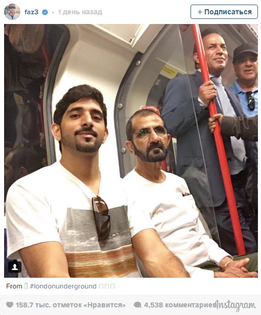 Наследный принц Дубая шейх Хамдан бен Мохаммед бен Рашид Аль Мактум опубликовал в своем аккаунте в социальной сети Instagram фотографию, где он запечатлен вместе с отцом, эмиром Дубая, вице-президентом, премьер-министром ОАЭ шейхом Мохаммедом бен Рашидом Аль Мактумом в лондонском метро.