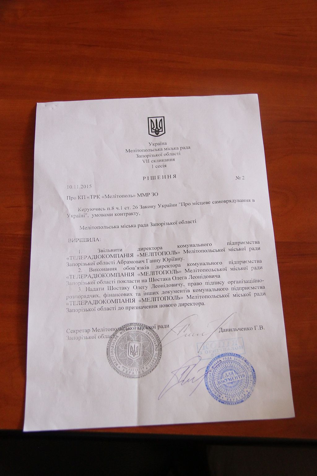 Сегодня утром, вскоре после начала рабочего дня, группа депутатов Мелитопольского горсовета от "Оппозиционного блока" пришли на территорию КП "ТРК Мелитополь" и расположилась в кабинете директора. Кресло руководителя предприятия занял Олег Шостак, директор ТРК "МТВ плюс".
