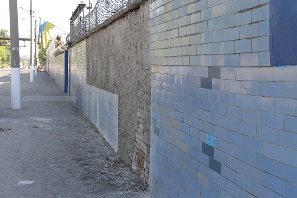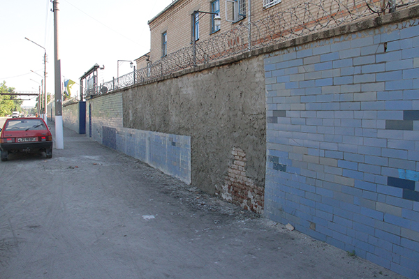 Вчера вечером неизвестные в камуфляжной форме снимали синюю кафельную плитку, которой выложен забор вокруг Мелитопольской исправительной колонии для несовершеннолетних.