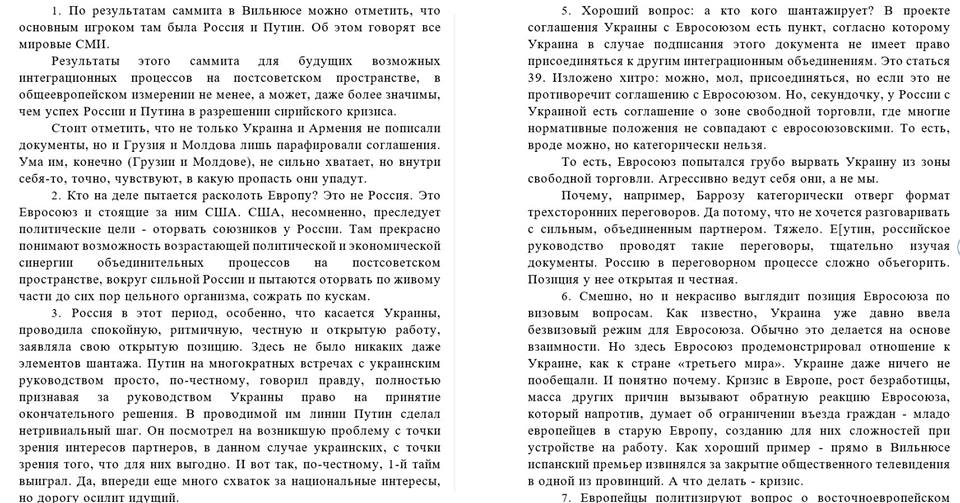 Далее приведены скриншоты текстов, в которых средства массовой информации должны были подавать "отказ" Украины от сближения с Европейским союзом в "правильном" с точки зрения Кремля ракурсе.