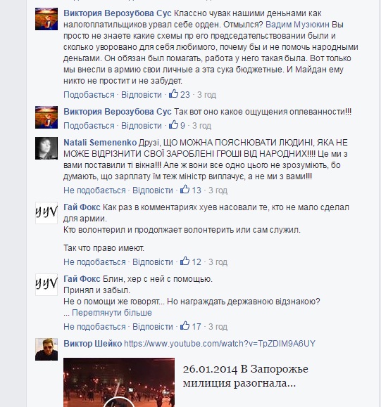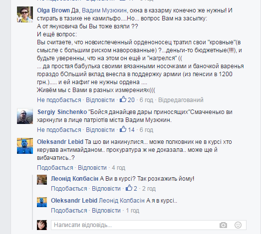"Окна в казарму конечно же нужны! И стирать в тазике не камильфо. Но - вопрос Вам на засыпку: а от Януковича бы Вы тоже взяли? И ещё вопрос: Вы считаете, что новоиспеченный орденоносец тратил свои"кровные" (в смысле с большим риском наворованные)? Деньги-то бюджетные(!!!), и будьте уверенны, что на этом он ещё и "нагрелся"", - пишет активист Ольга Браун.