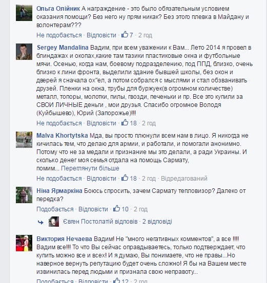 "Следующим этапом помощи от областного совета под председательством Межейко было то, что они взяли над нашей частью официальное шефство и выделили 500000 грн, за счет которых мы могли приобрести новый автомобиль, 8 стиральных машинок и тепловизор. Это тоже нам не надо было брать? Надо было в тазике стирать??? Или от машины отказаться или нам тепловизор в зоне АТО не нужен", - написал Музюкин.