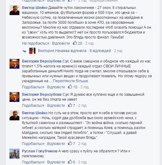 "Давайте чуток лаконичнее - 27 окон, 8 стиральных машинок, 10 мячиков, футбольная форма и 500 т.грн, это цена за - Небесную сотню, за покалеченные жизни разогнанных на майдане в Запорожье, за почти 3000 погибших в зоне АТО?", - написал скульптор Виктор Шейко.