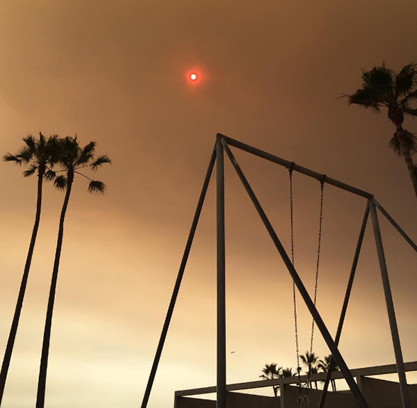 Необычно красный цвет солнца и обрамляющая его кайма связаны с тем, что небо над Калифорнией застилает дым от пожаров, которые бушуют в пригороде Лос-Анджелеса. Над районом бедствия поднимаются клубы густого дыма.