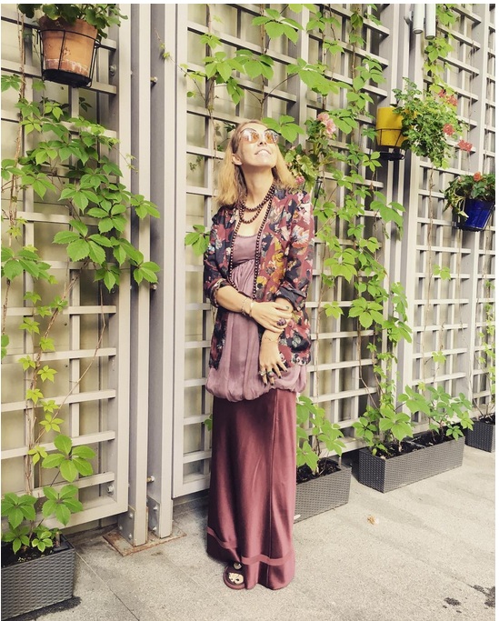 Так, на одной из последних публикаций телеведущей она позирует в элегантном и стильном лиловом наряде с аксессуарами, прикрывая одной рукой уже округлившийся животик.