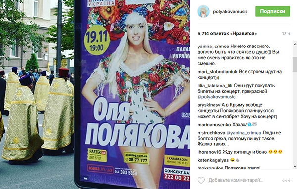 Решив пошутить, 32-летняя блондинка выставила фото с афишей своего концерта, на фоне которой шел крестный ход православных священников.