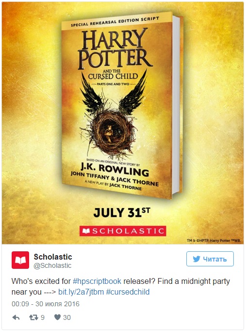 Восьмая книга серии Джоан Роулинг о Гарри Поттере - "Гарри Поттер и проклятое дитя" появится на прилавках книжных магазинов в полночь 31 июля, в день рождения Роулинг и главного персонажа ее произведений, говорится в Twitter издательства Scholastic.