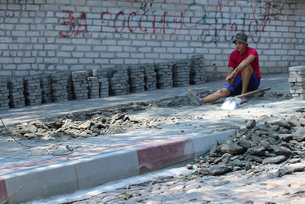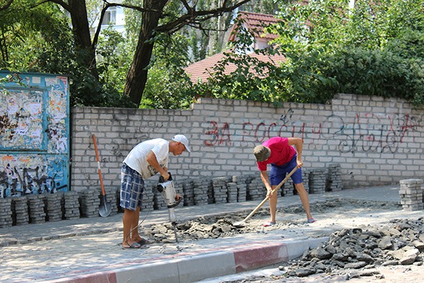 На ул. Университетской (бывш. Свердлова) возобновились работы по укладке тротуарной плитки.