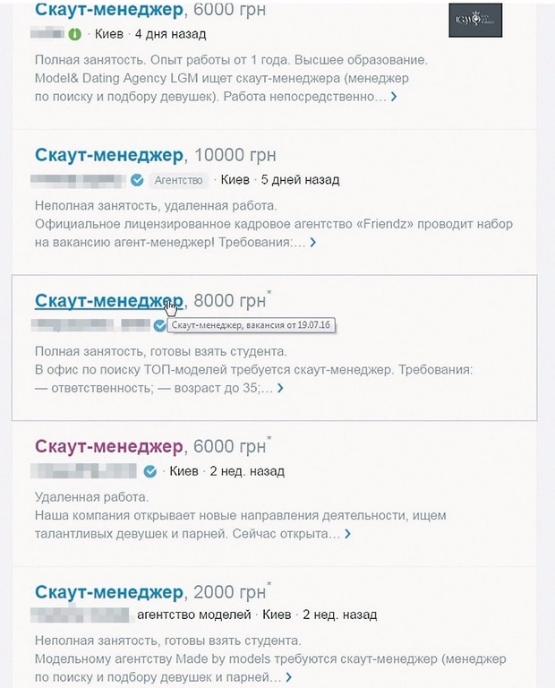Одно из объявлений гласит, что некая компания, занимающаяся монтажными и строительными работами, расширяет сферу деятельности и разыскивает скаутов — коммуникабельных молодых юношей и девушек для поиска и привлечения клиенток в закрытый клуб VIP-знакомств. Среди обязанностей — сидеть в соцсетях, переписываться с красотками, проверять их анкеты и завлекать в клуб. Зарплату предлагают высокую. Плюс проценты за каждую "завербованную" — от 400 гривен. Обещают, что можно и 20 тысяч заработать.