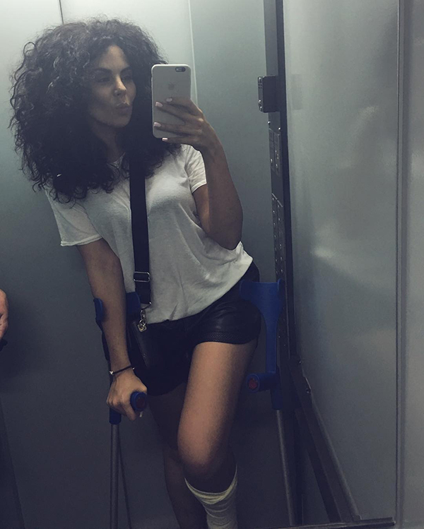 На одном из снимков травмированная звезда позирует в коротких черных шортах и белой футболке в лифте. "Нарядилась", – подписала кадр певица.