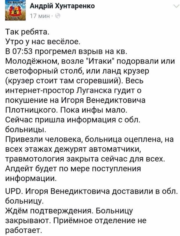"В Луганске взорвана машина главы самопровозглашенной ЛНР, два человека ранены, уточняется, был ли в машине сам Плотницкий", - говорится в сообщении РИА Новости.