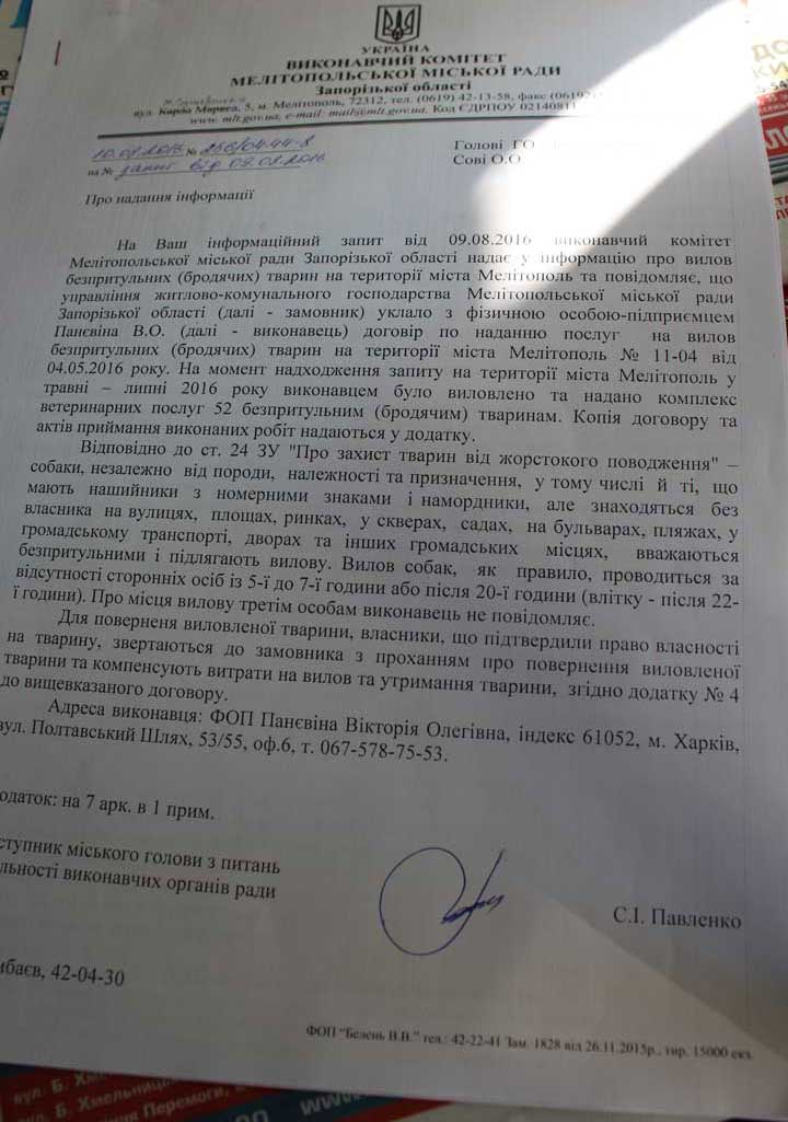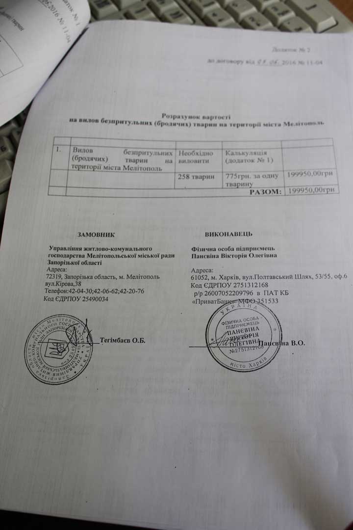 Отметим, что согласно договору ФЛП Паневина В.О. должна до 31 декабря 2016 года выловить в Мелитополе 258 собак на общую сумму 199950 грн. В мае-июле, по информации начальника Управления ЖКХ Алексея Тегимбаева, выловлено 52 собаки.