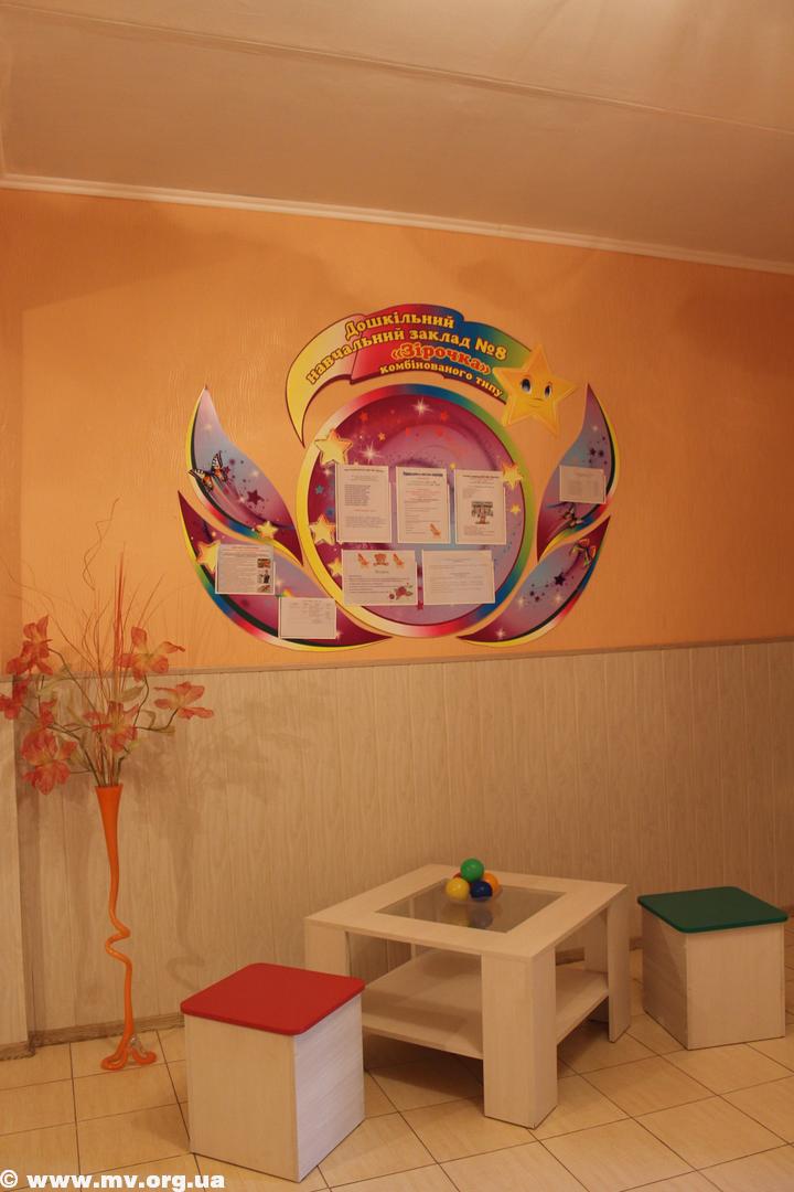 В холле детского сада везде сделан свежий косметический ремонт, также свежими обоями радуют комнаты в четырех группах и коридорах. Кроме этого, уже поменяли больше половину окон (на 100 тыс. бюджетных гривен), и в сентябре установят оставшиеся. Что касается утепления фасада здания, то детский сад №8 пока что даже не стоит в плане.