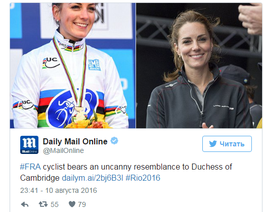 Зрители телетрансляций Летних Олимпийских игр в Рио-де-Жанейро обратили внимание на необычайное сходство французской велогонщицы Полин Ферран-Прево с герцогиней Кембриджской Кейт Миддлтон, сообщает Daily Mail.