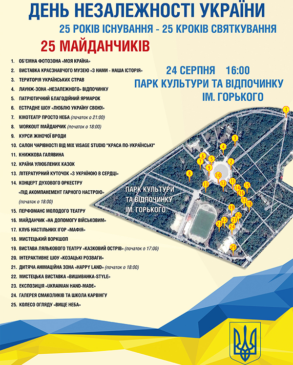 Парк культуры и отдыха им. М. Горького в среду, 24 августа, предлагает отметить 25-ю годовщину Независимости Украины на 25 праздничных локациях.