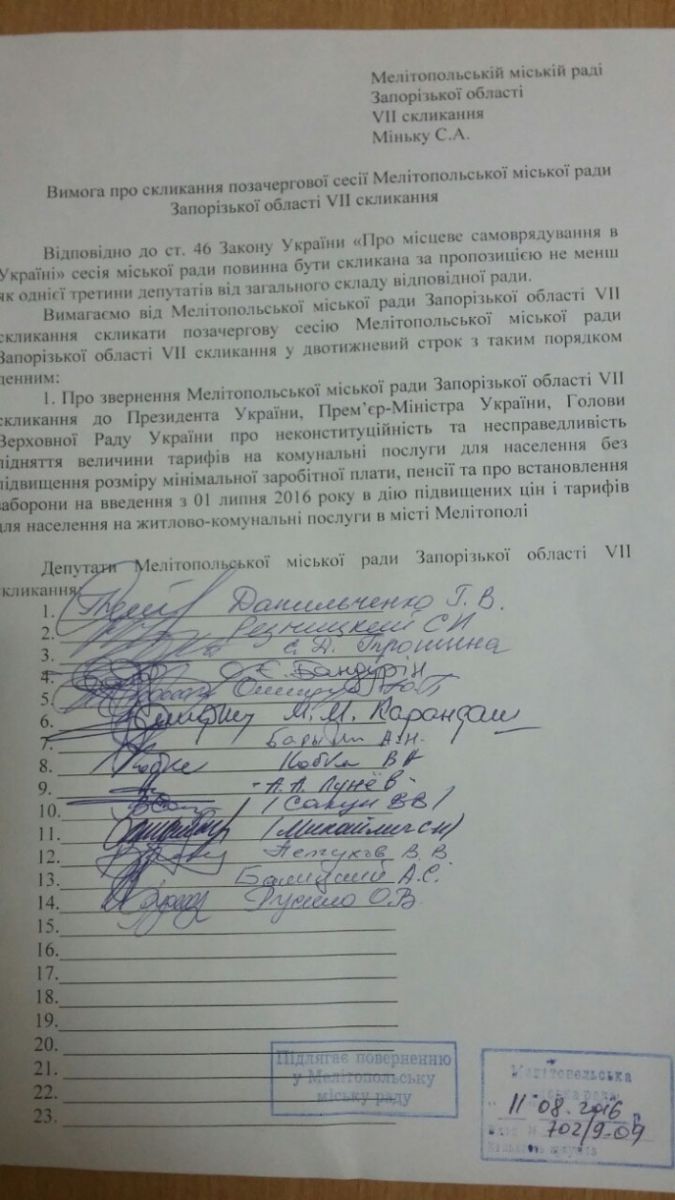 Данным документом 14 депутатов горсовета (все от "Оппозиционного блока") требуют созвать внеочередную сессию с одним вопросом в повестке дня: