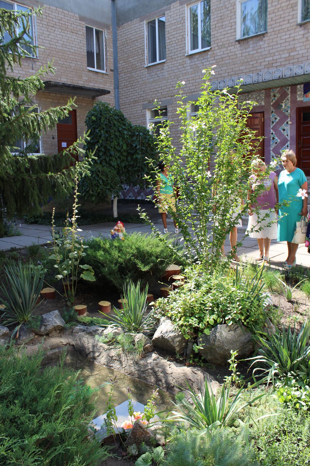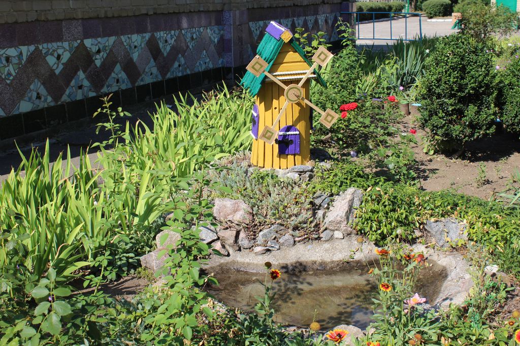 Очень много на территории клумб, которые в такое жаркое лето несколько потеряли вид. К сожалению, администрация сада из-за финансовых проблем не может обеспечить своим цветам полноценный полив и нужную им влажность. В садике даже поддержали городскую инициативу и тоже сделали клумбу в виде флага Украины. К слову сказать, детсадовская клумба даже больше похожа на флаг, чем городская.