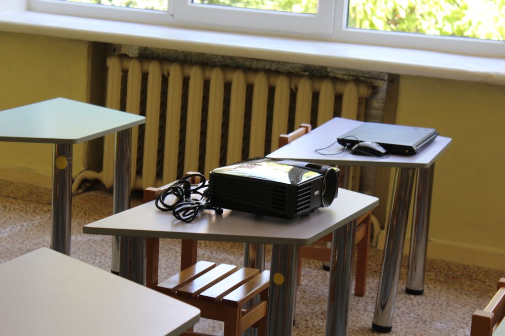 Отдельно в детском саду оборудовано помещение для занятий математикой и грамотой. Здесь установлены парты, доска, проектор. А воспитатели для занятий используют ноутбуки, идя в ногу со временем.
