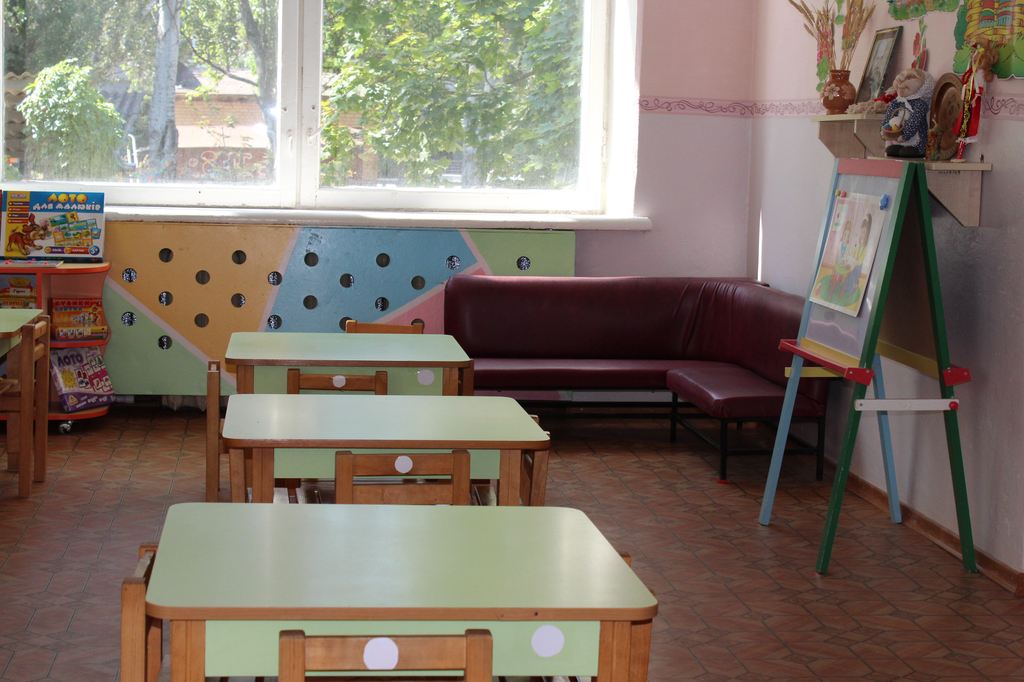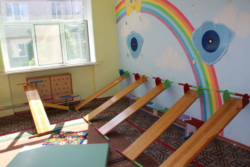 В саду, помимо стандартной для всех дошкольных учреждений логопедической группы, есть еще и группа для деток с нарушениями опорно-двигательного аппарата. Здесь для них оборудована и отдельная группа со столами-трансформерами, и закуплен спортивный инвентарь, и даже установлен массажный стол.