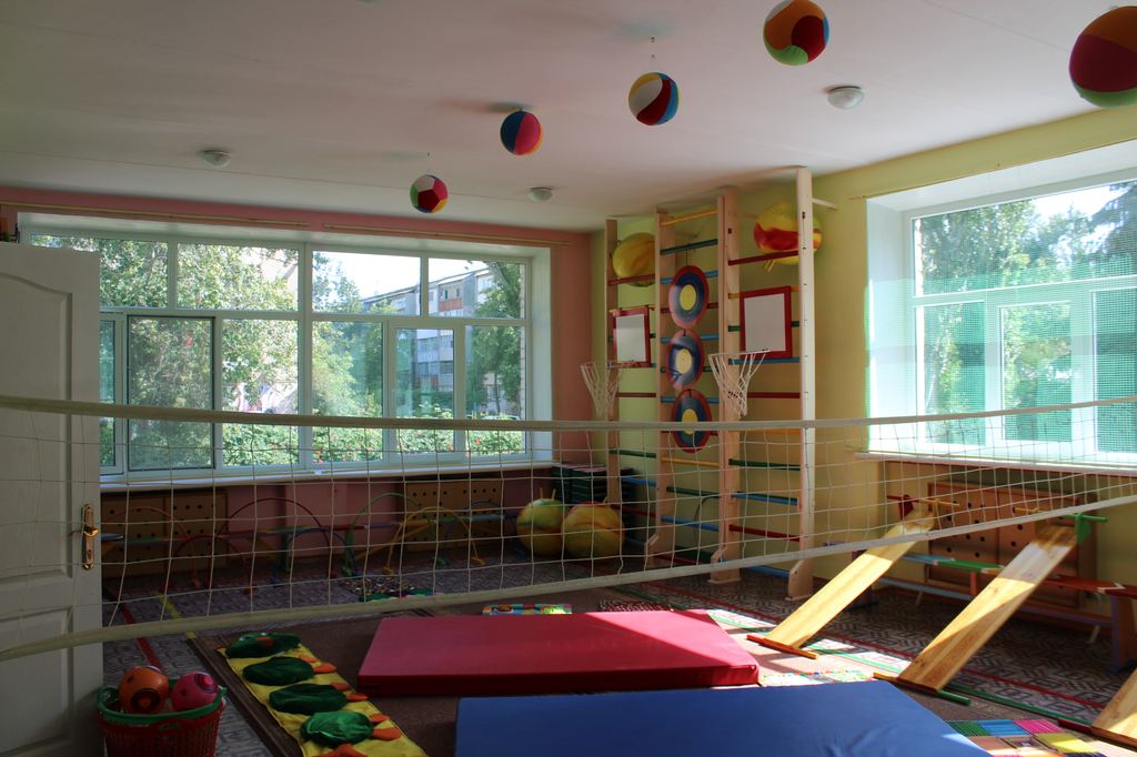 В этом детском саду очень хороший спортивный зал. Несмотря на то, что помещение не такое уж и большое, здесь помещается много инвентаря, в том числе и низко натянутая волейбольная сетка для старших групп.