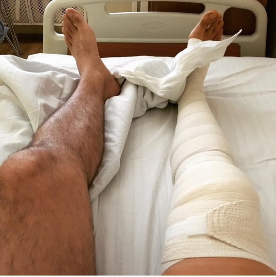 "Доктор так сказал: "Футбол в вашей жизни остается. Но месяца два Вы просто теоретик". Хорошо, что сезон начался. Хоть понаблюдаю", – грустно подписал снимок загипсованной ноги актер.