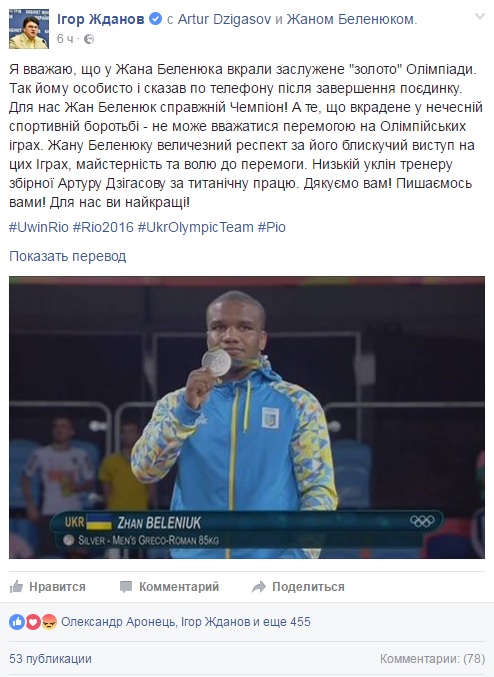 Министр молодежи и спорта Украины Игорь Жданов эмоционально прокомментировал серебряную медаль украинского борца греко-римского стиля Жана Беленюка на Олимпиаде-2016.