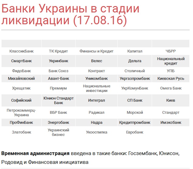 В стадию ликвидации перешли банки: "КлассикБанк", "СмартБанк", "ФидоБанк", банк "Михайловский" и "Евробанк". Временная администрация введена в Государственный земельный банк (Госзембанк), который был создан в 2012 году.