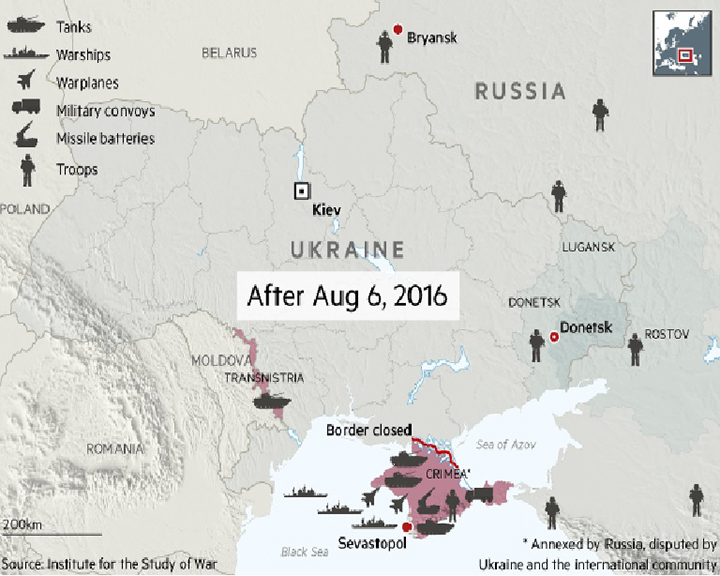 В частности, Россия разместила воинские части с тысячами войск на севере в Брянске, на востоке близ Ростова, на юге в Крыму и на западе в Приднестровье.